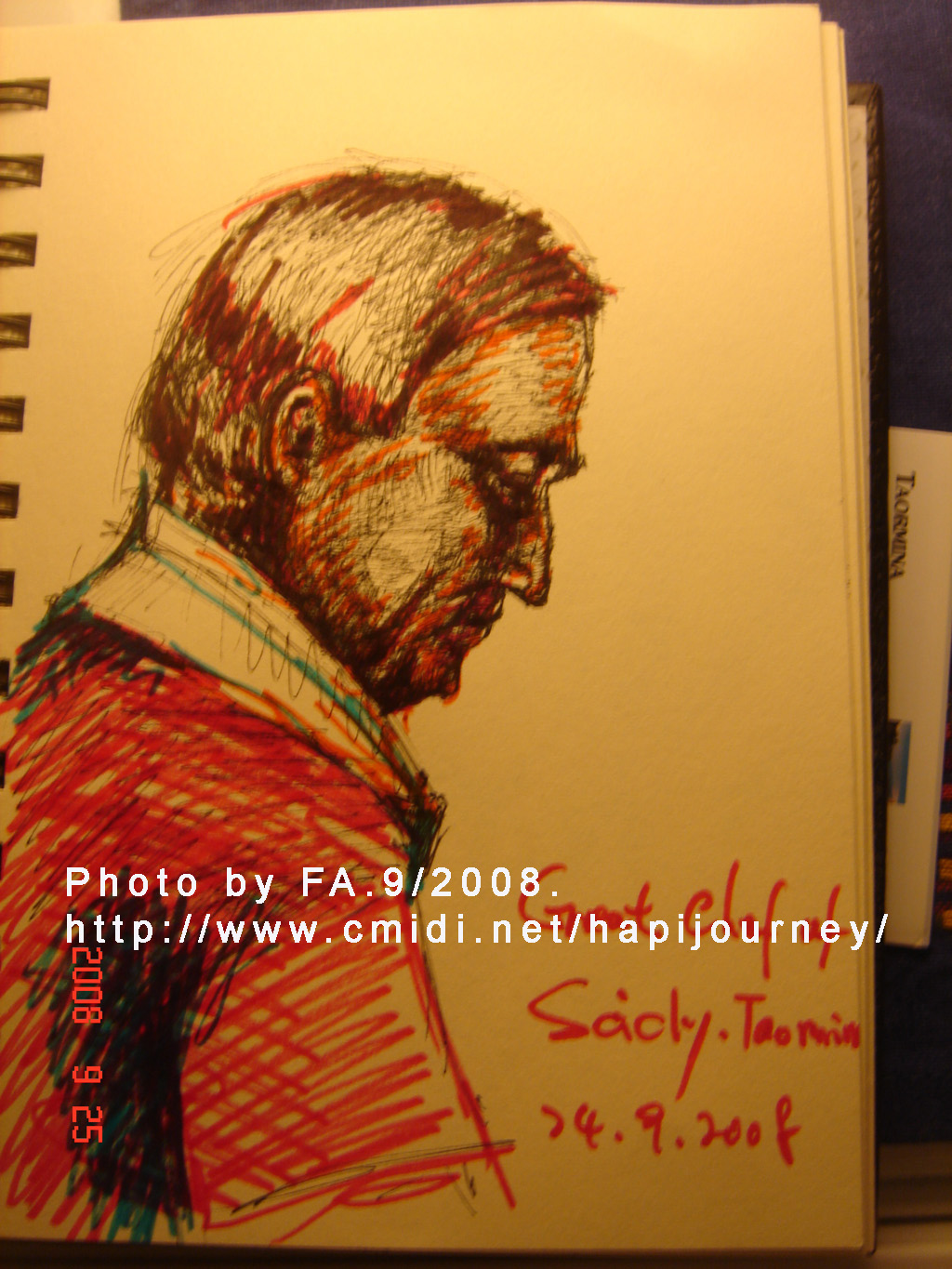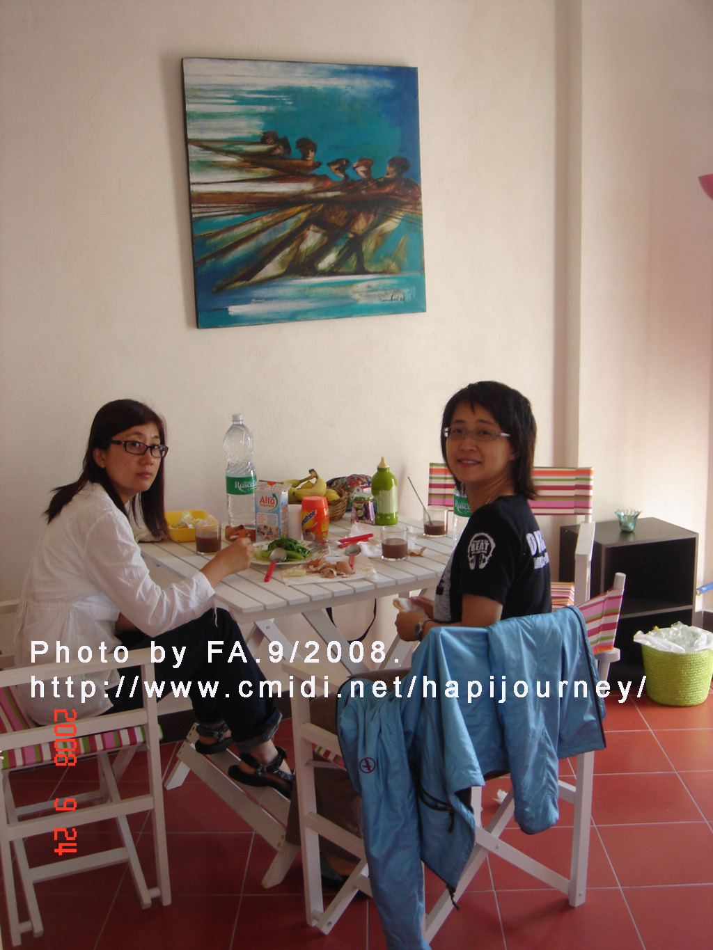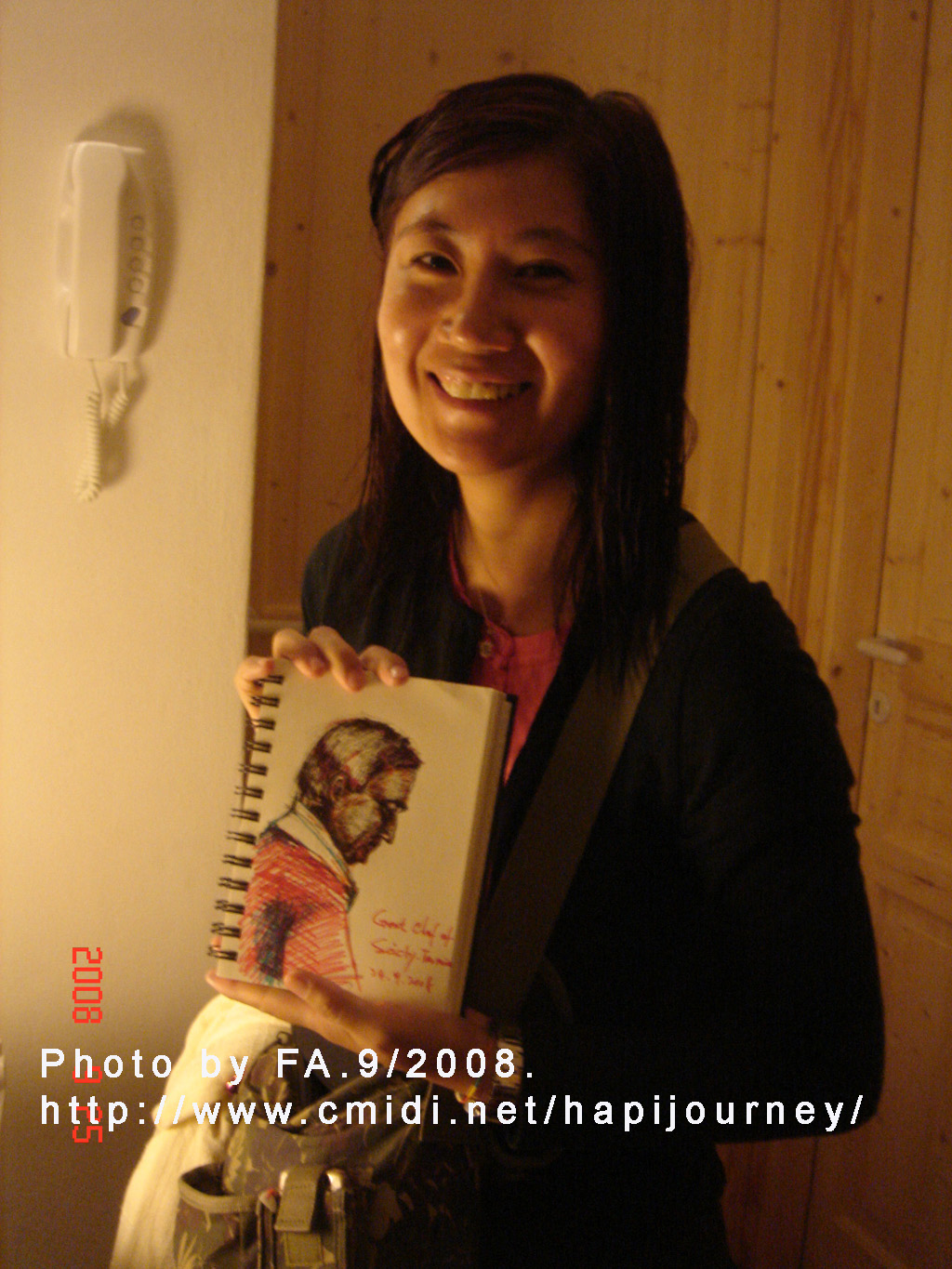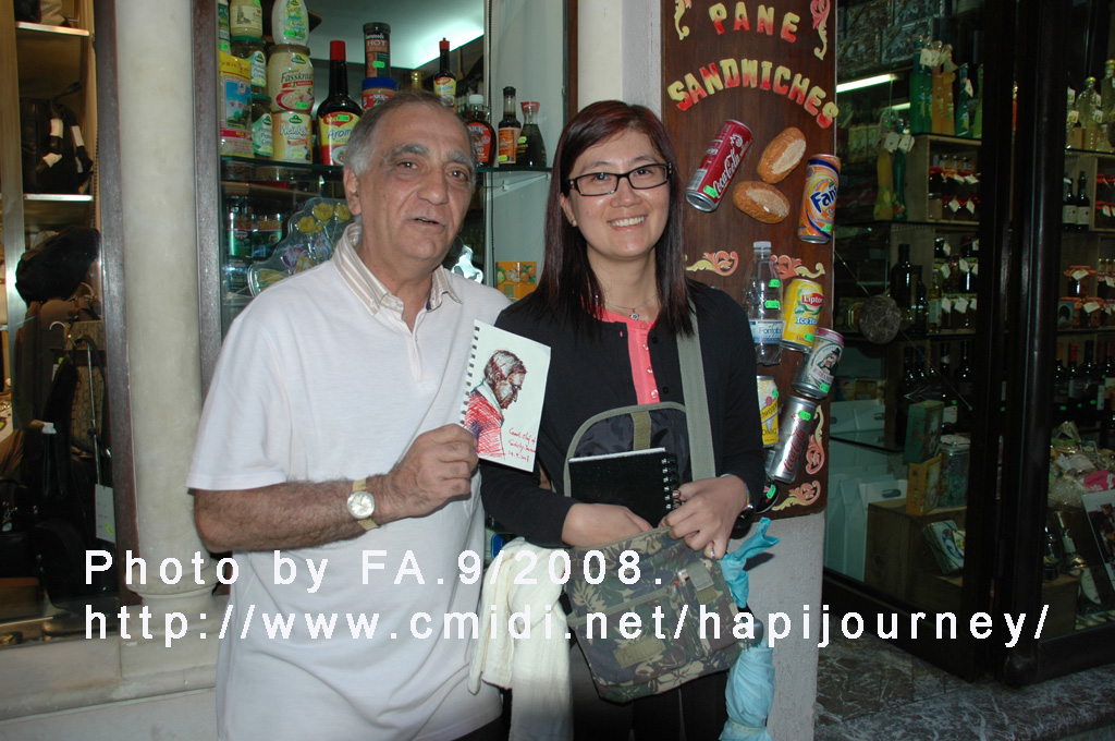 然後我們就回去偷偷梳洗(因我們已退房了,照理不應使用旅館裏的設施,但旅館的大門一向都是不鎖的,直到晚上12時正才有來鎖門的)。一切搞掂後,就先找吃的,後就到昨晚的阿叔店子裏買手信回去,並把急急畫好的畫送給他。