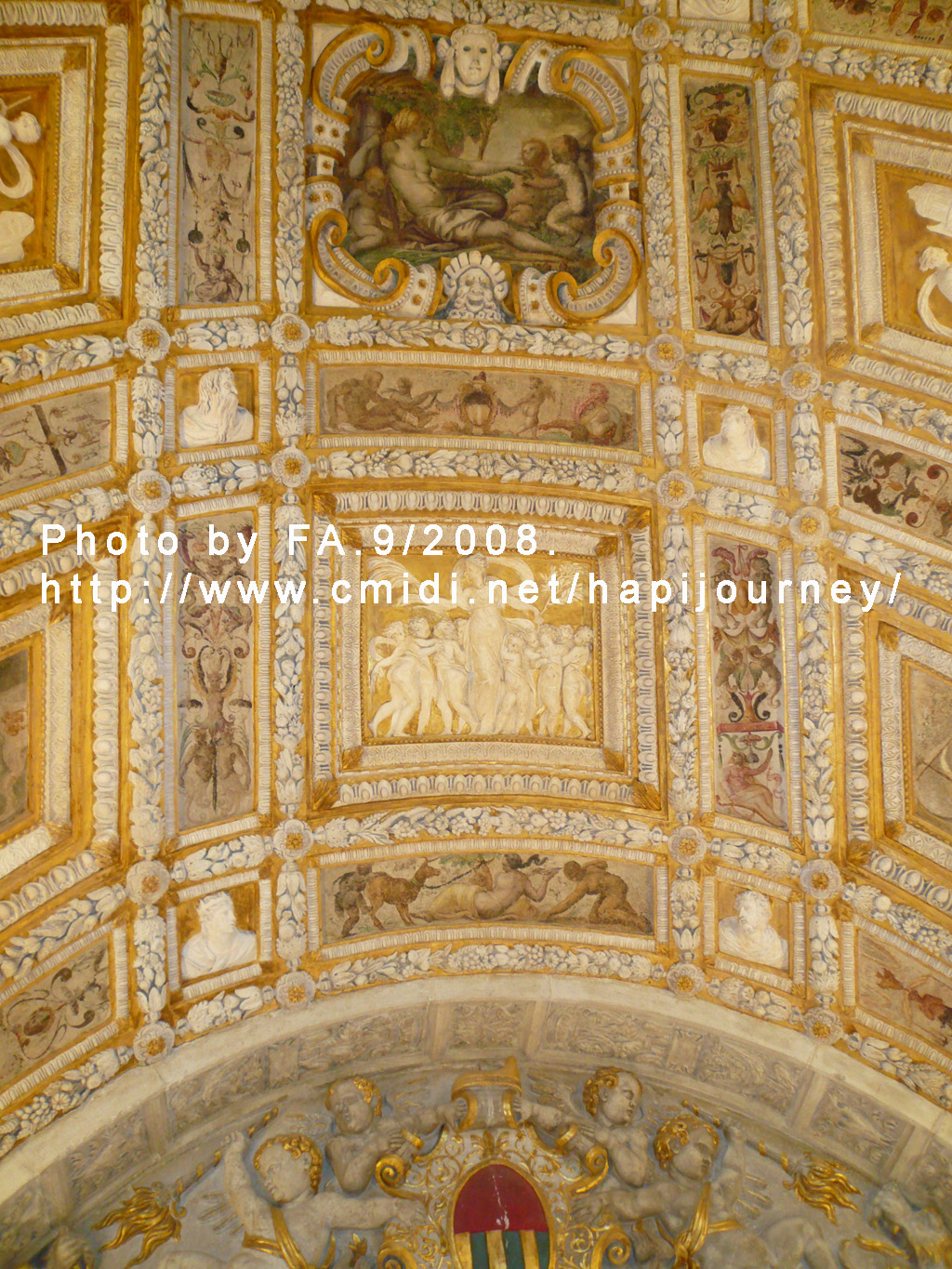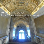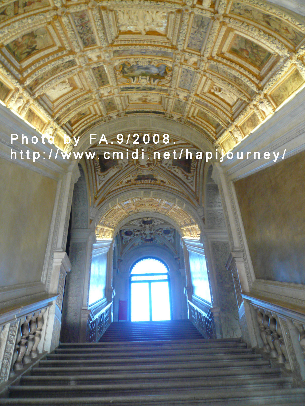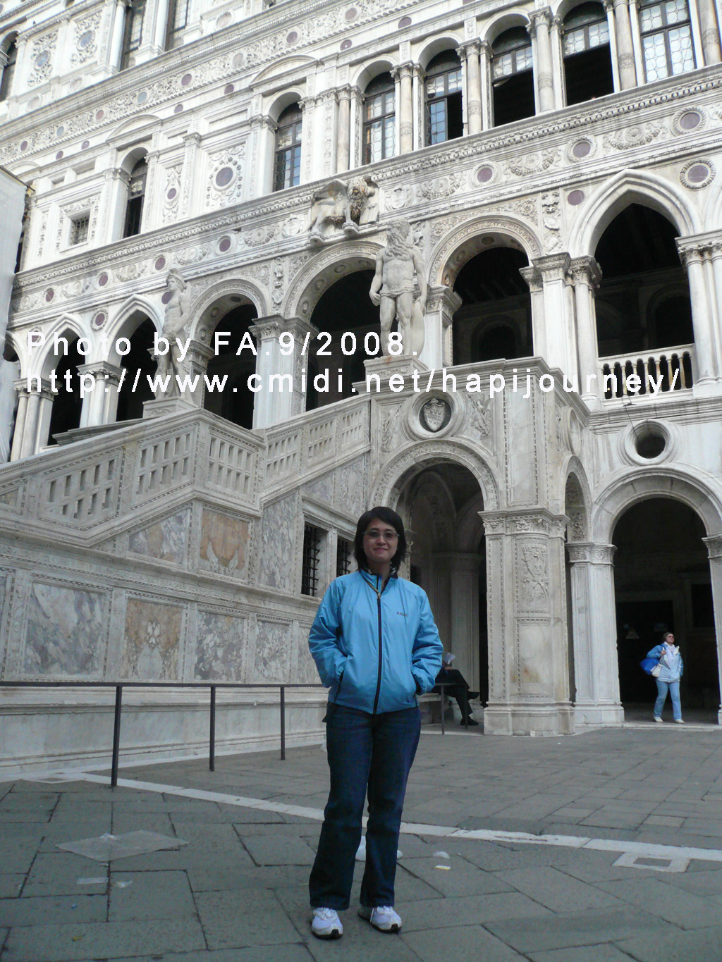 我們由青銅大門Porta della Cartal「紙門」的意思,原為總督府的大門)進入總督府,進入東側的階梯為著名的「黃金楷梯」(Scala d’Oro),之所以稱為黃金階梯是因為這裏的裝飾都是用24k的黃金打造(於1559年完成)。由於年代久遠,我們現所步上的只是名叫「黃金」的階梯入場,就可到其他廳室參觀,之後就到盔甲武器展覽室,接著就走過小小的嘆息橋(Ponte dei Sospiri),可惜也被一大塊藍布遮蔽著,暫時看不到書中所言典雅的白色大理石橋,反面卻走過連接著總督府與對面的牢房。