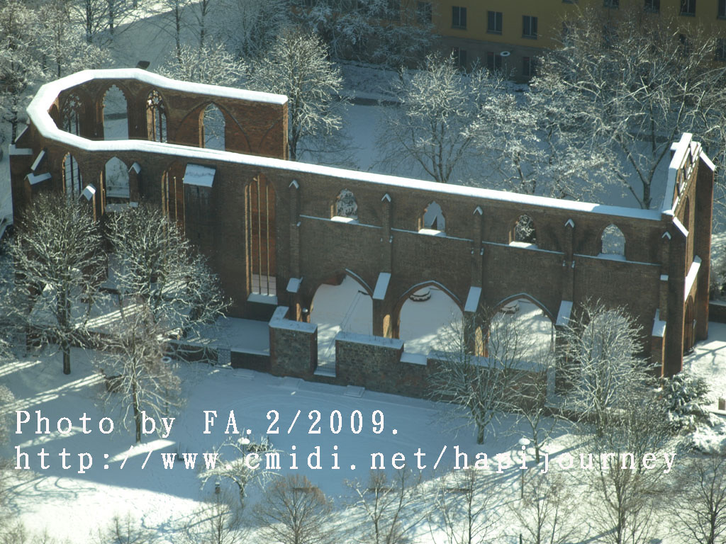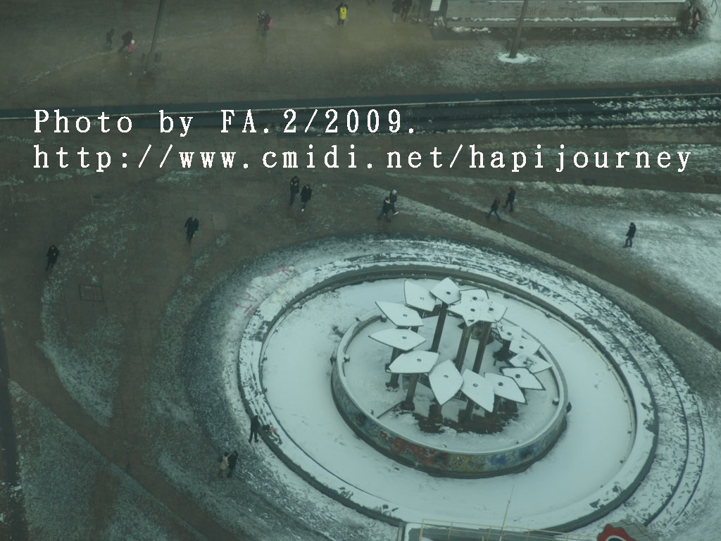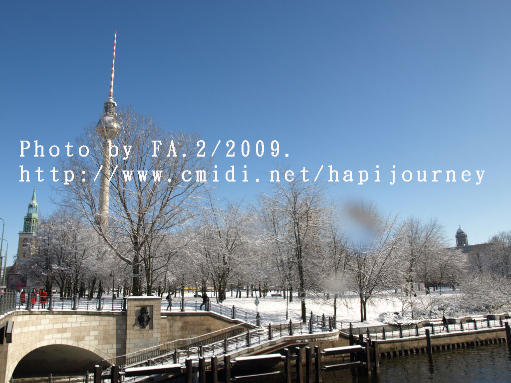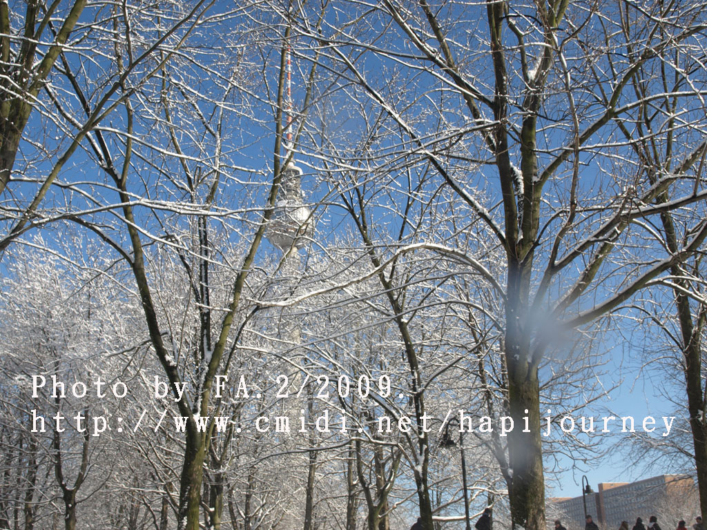 下了整整兩天的雪,雪後的柏林變得比之前更美,加上晴天,整個景象剛變得生氣盎然,好不愉悅。而我因為同房的反應:這麽好的天氣,登上塔樓俯瞰整個柏林市會否是白茫茫一片,什麽都看不見呢!所以我11時前就步行至柏林的聖母大教堂,希望可以登上塔頂看看是否如此景況。誰知教堂沒有開放塔頂讓人參觀,那我惟有決定登上另一高塔—電視塔,能360度看看柏林的市景。