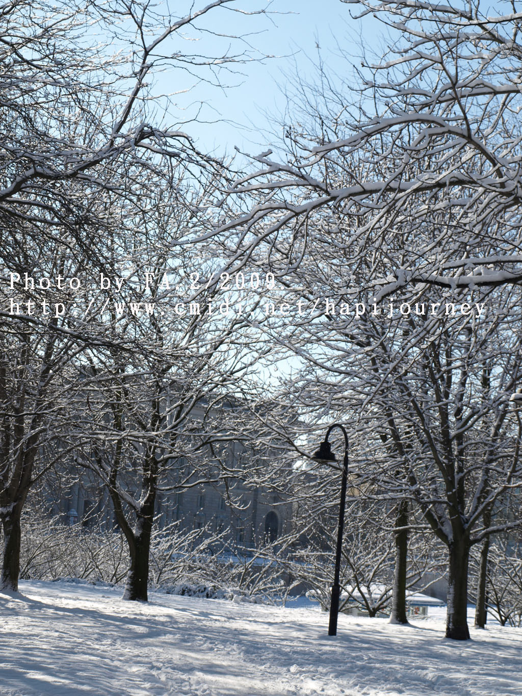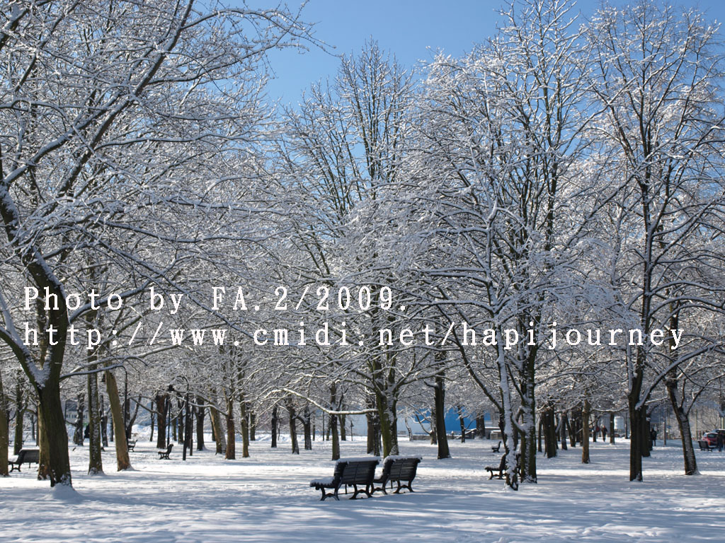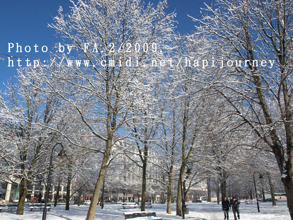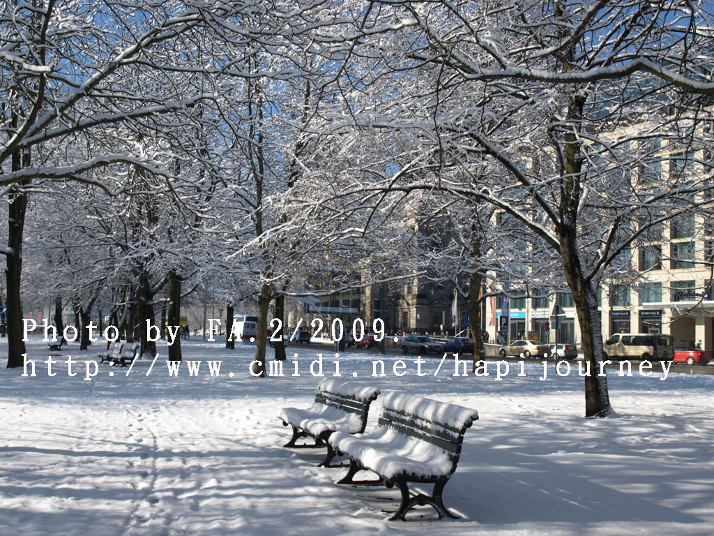 然後我決定步行回去,因為沿途有很多樹木,加上下了雪相信拍照應該很不錯的。果然沿途所經過的雪景真的一流;不過我則走了差不多兩個小時才到新國會大夏附近,這時候排隊的人也少了,但不知為何我仍是不肯進去,打算明天才來。