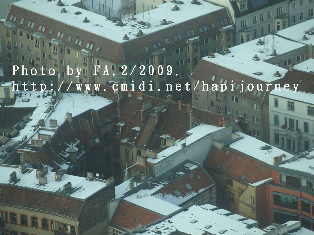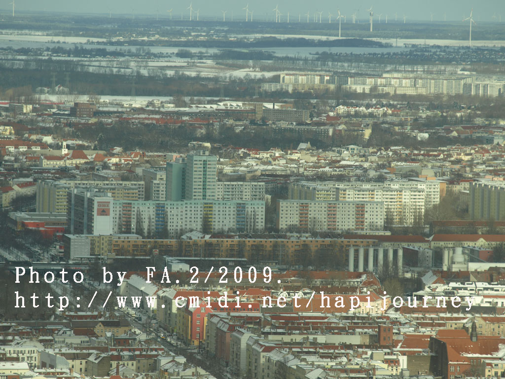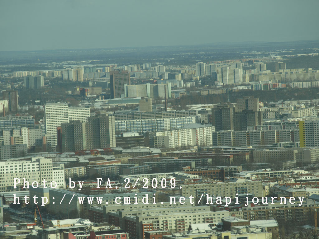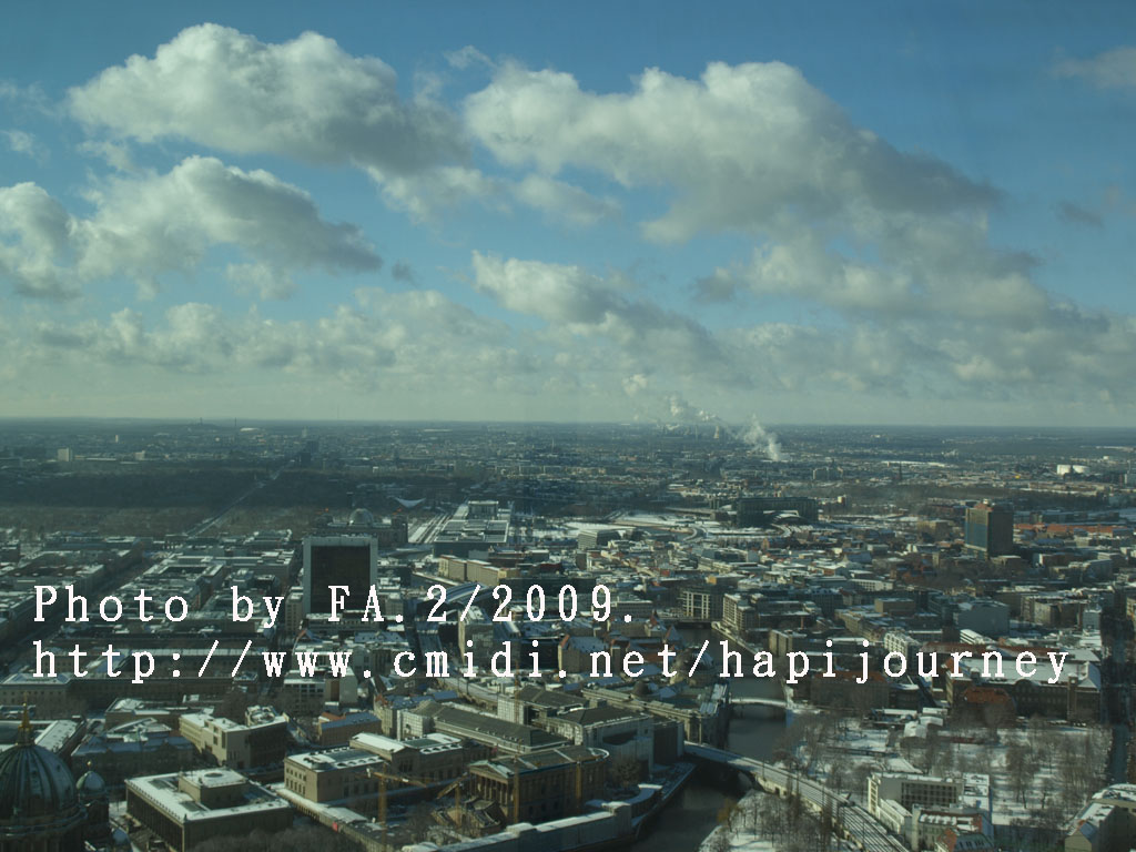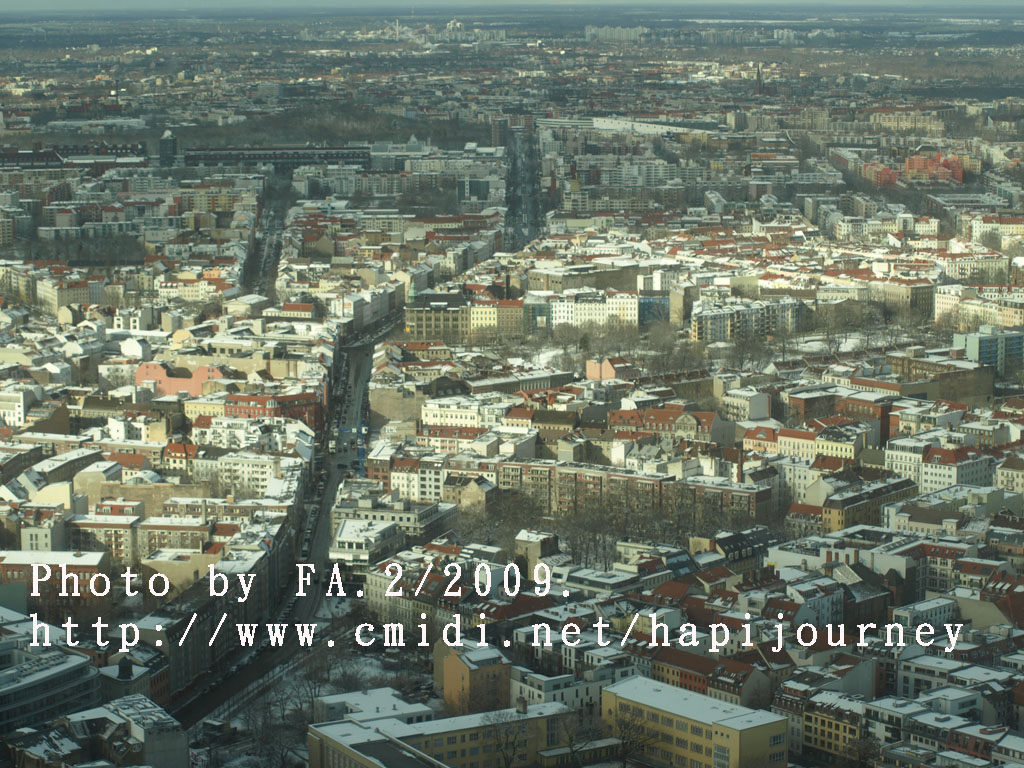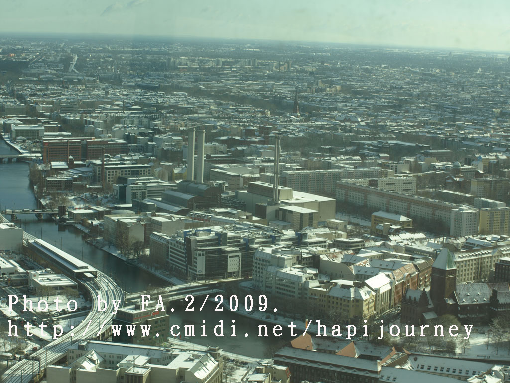 這電視塔不是全球最高的,最高的好像是中國;上去這電視塔最高之處從360度俯瞰整個柏林的任何地方,發現這裏和慕尼黑或其他地方很不同的,可能雪把屋頂顏色遮蓋住,加上陽光的變化,或者其本身的建築物有現代的高樓大夏、有傳統的紅磚屋,又或是其本身的地理位置構成一個與別不同的顏色及結構,非常柔和和統一。