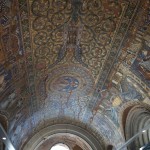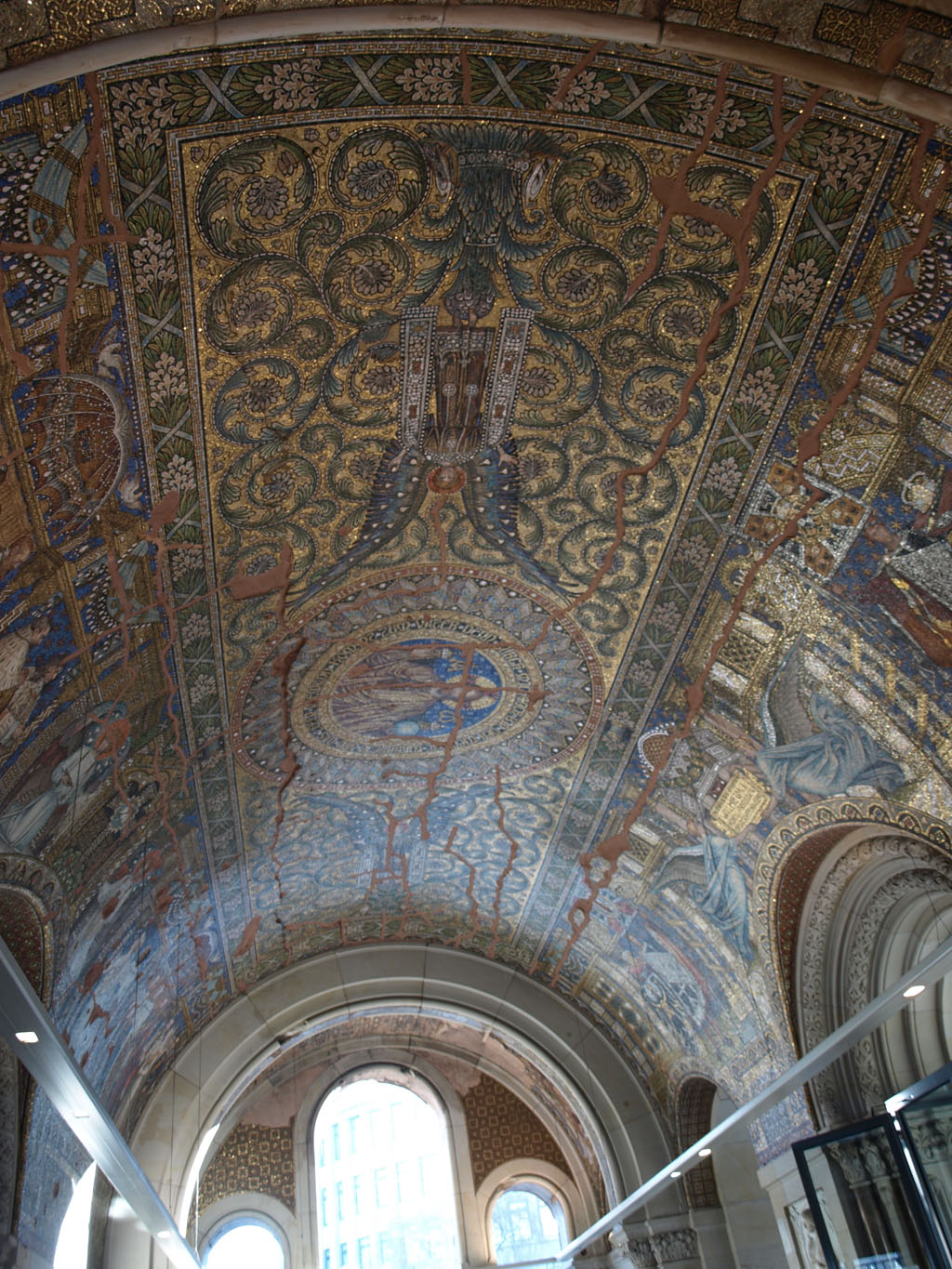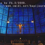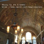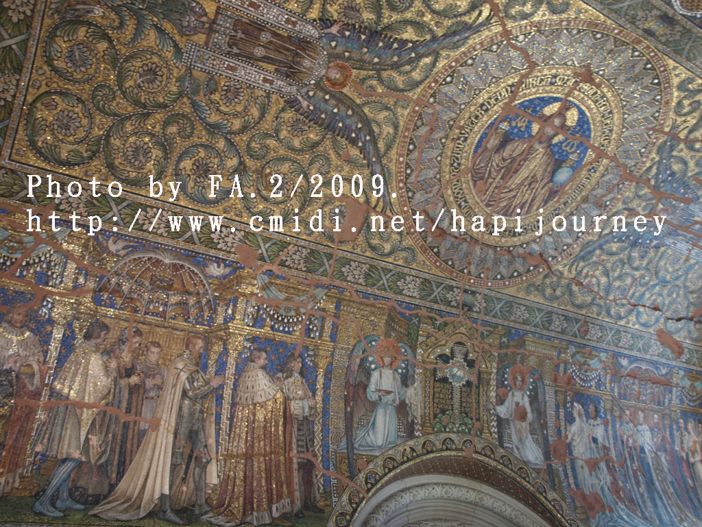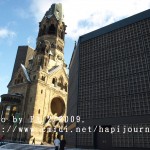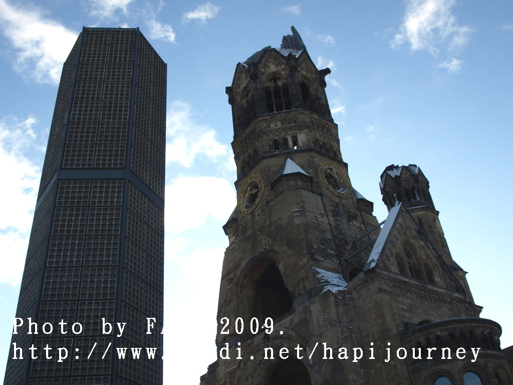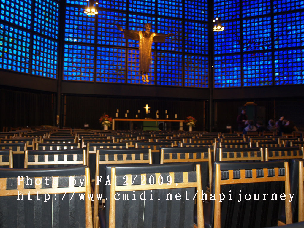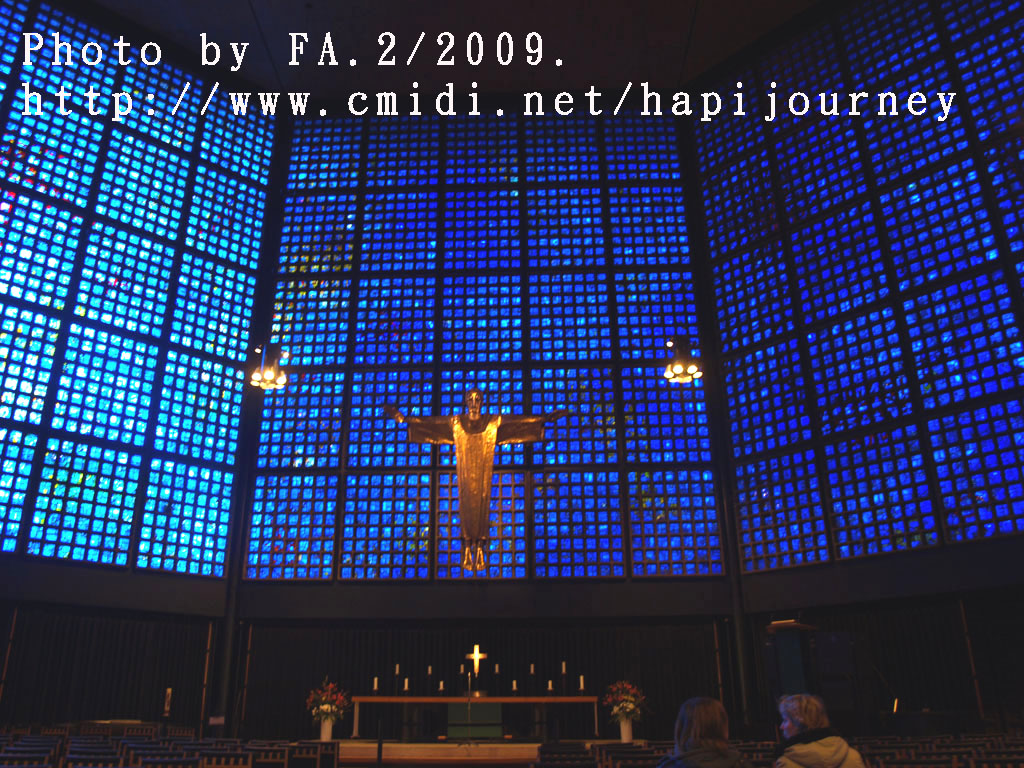 跟著就坐地鐵到動物園火車站,看看享譽盛名的威廉大帝紀念堂(Kaiser Wilhelm Gedachtniskirche),出名並不是她的歷史長久而是她的經歷:她原是建於1895年,後因第二次世界大戰時被炸毁,至今仍未修復(是刻意不修復,目的是為了提醒人民戰爭的破壞力);而旁邊的一個充滿現代化的多邊形教堂內裏的玻璃畫則以藍色為主,耶穌像就像從藍色的天空中俯視著整個柏林、甚至整個世界一樣,非常有意思和美!原來玻璃窗可以這樣的組織法。