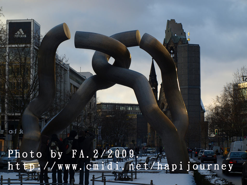 跟著就是到與之相對的柏林環,雖是象徵曾經分裂的東西柏林雖是合併,但彼此的缺口仍在;在此回望威廉大帝紀代堂,在在提醒世人不要再作一些愚不可及的事了。