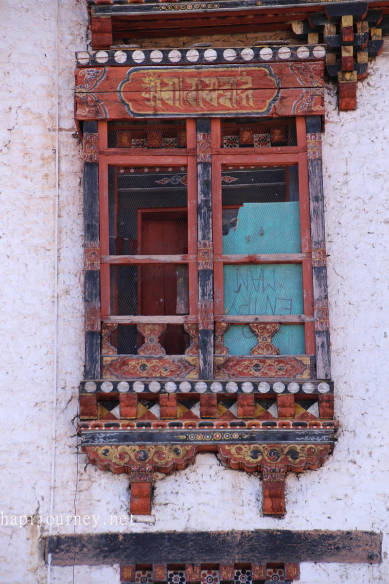 肚子餓了,車子把我們載到民間博物館附近的一間充滿不丹特色的館子享用午餐,在等候其間,我們就出去閒逛和拍照。只見每間庭院中掛了一些農作物,也有一些面具;而有些泥黃色的屋子外裏都擺設了一些農具和家具,如紡織機等。同時這些在圍牆裏的傳統小屋都是兩層的,上層為住所,下層為廚房或是伺養家禽之用。