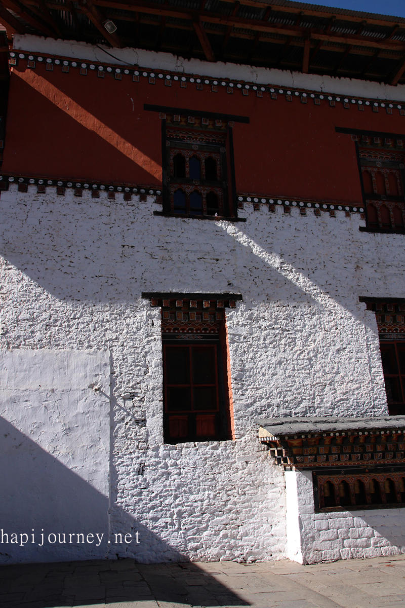 走進廷布的市中心,路上的街景並不如我們所熟悉的城市般,充滿現代化筆直的拉線,抑或是設計風格滿檔的落地玻璃窗,放眼所即,都是3層樓左右的矮房,最高,也大概5層樓,雖然感覺起來多數樓房都已不再採用木頭建築,而已較為方便的水泥來做為建材,但就外觀來說,則彷彿停留在舊時代般,充滿不丹的風格。只因不丹有非常嚴格的法規去規範,對他們來說,整體的建築造景,是屬於全體國民所擁有,因此不能因個人想法任意改變其傳統的樣式,且在蓋之前就必須將設計圖交出給政府,以利審核整體市容。不過室內的話,不丹政府則不會加以管制。而這樣的規範,其實就像是日本京都的某些區域般,為讓整體的街景跟風格能承襲如古鎮式的感受,所做的協調與規定。