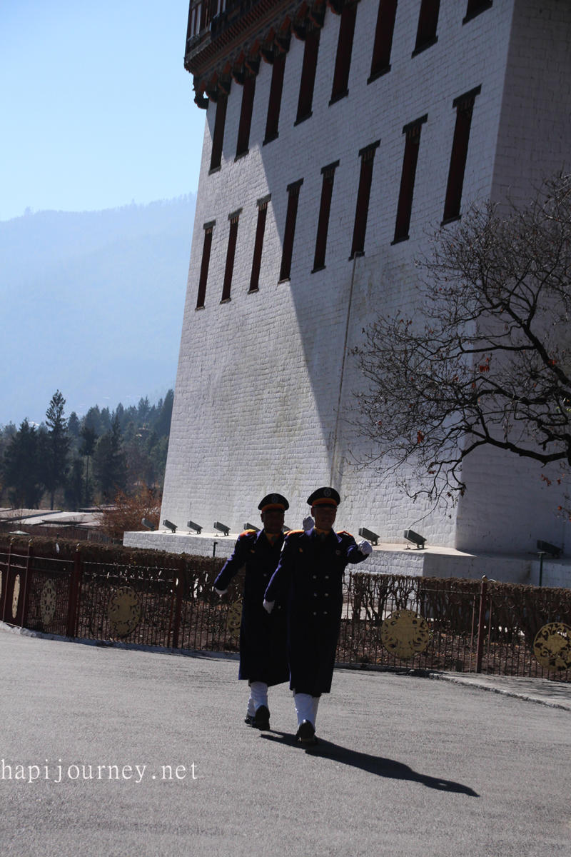 走進廷布市中心,只見紀念碑裏外充滿人羣,警察則在旁協助維持秩序,卻不給我們進內參觀。原因是這裏正在進行祈禱活動,今天不向外開放。我們只好在外牆外一窺裏面的情況:只見穿着統一服飾的男女圍着紀念碑四方席地而坐,有的唱經,有的拿起綠色的鼓訓練有素的拍打,有的在中途加入,而台上的主持在進行儀式。聽導遊說他們正為着世界和平而祈禱。在這普天同慶的日子,不同宗教人仕正為着人類的和平祈禱着。